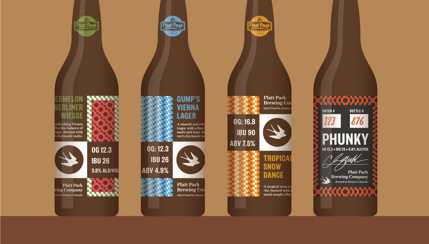 I recently designed all the packaging for Platt Park Brewing Co, a brewery in Denver Colorado. The final labels are printed on metallic material, and the modular system of information and pattern elements helps to provide a level of differentiation between products without sacrificing the cohesive appearance of the entire line.